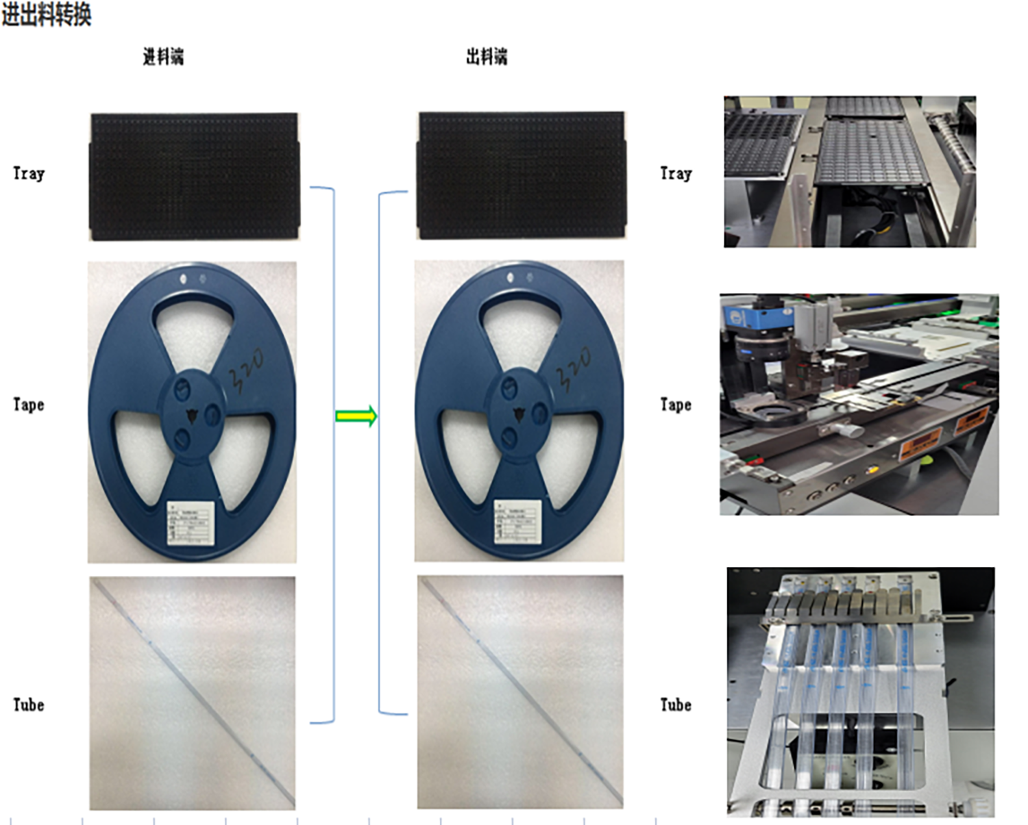 支持編帶/TRAY盤/管狀進(jìn)出料方式,支持包裝轉(zhuǎn)換功能